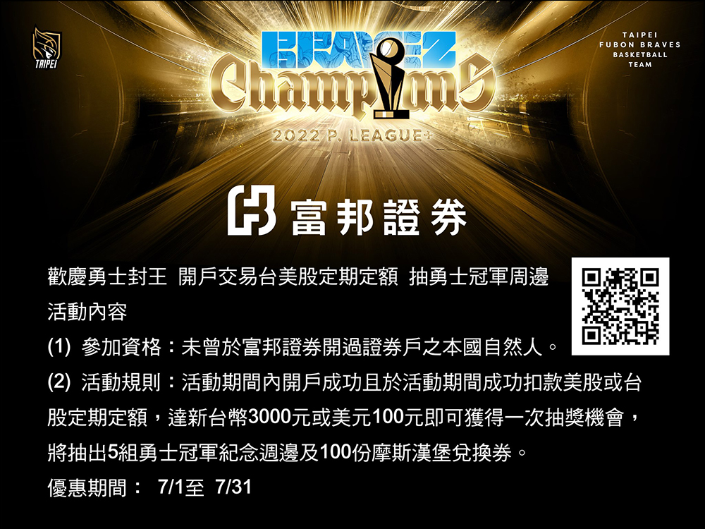 自 7 月 1 日至 7 月 31 日期間,開戶交易台美股定期定額,將抽勇士冠軍紀念周邊及摩斯漢堡兌換券。