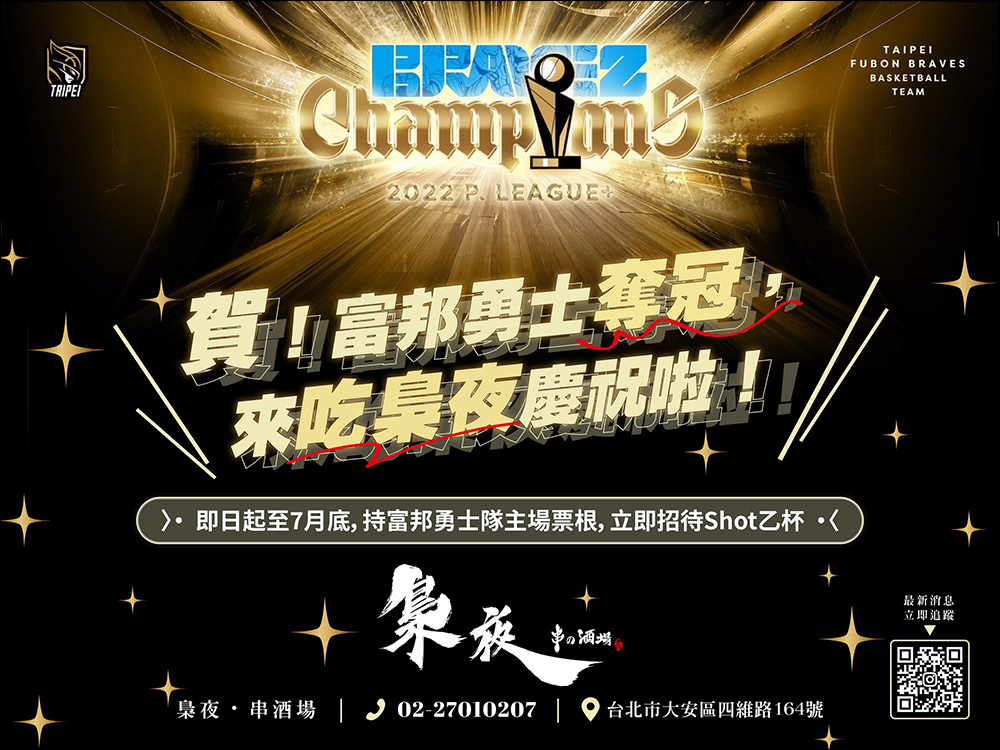 自 6 月 28 日至 7 月 28 日期間,憑富邦勇士主場票根或攜帶富邦勇士周邊小物至店消費並發文或限時動態打卡,即招待 shot 一盤慶祝(一桌限一次)。