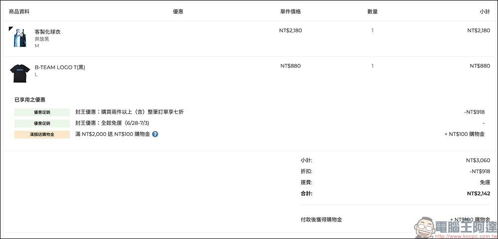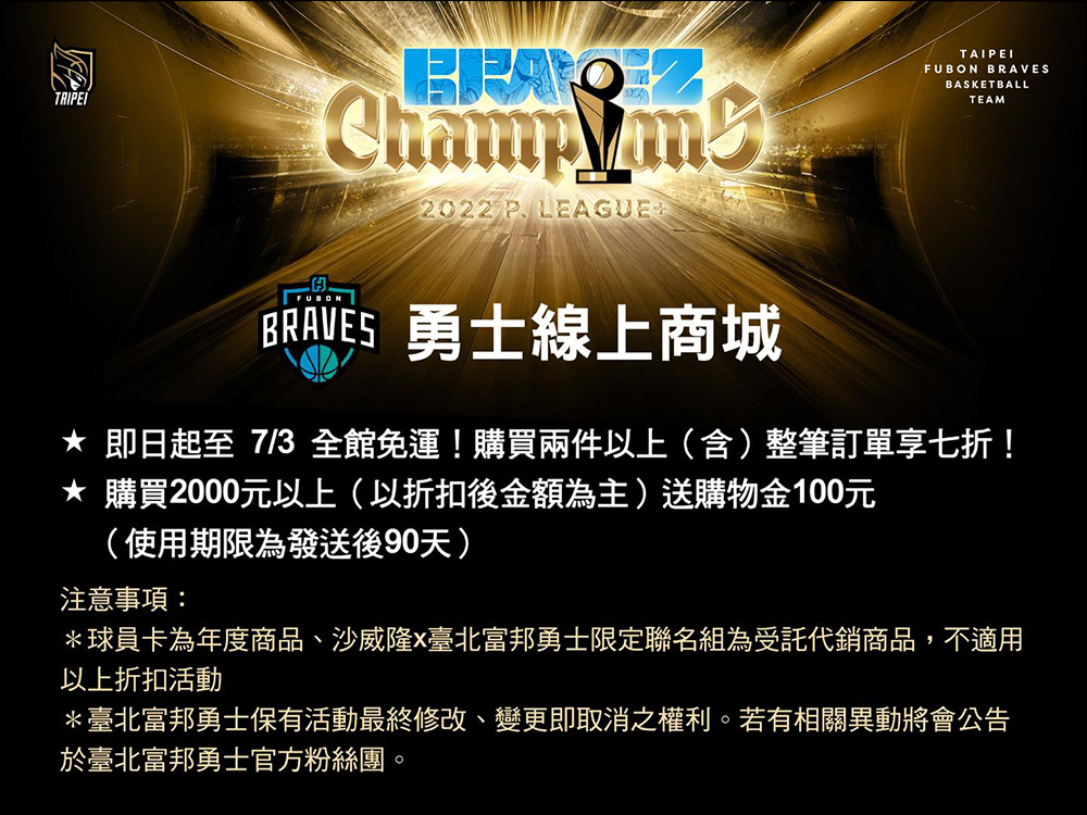 臺北富邦勇士封王後,球迷想收藏勇士的球衣等周邊商品趁現在囉!因為自昨(28)日起至 7 月 3 日期間,臺北富邦勇士官方商城享全館免運!而且只要購買兩件(含)以上,整筆訂單直接享 7 折優惠!單筆訂單滿 2,000 元,另外加贈購物金 100 元。