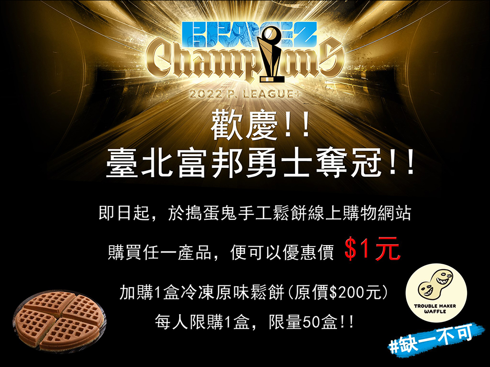 自 6 月 28 日起至導彈鬼手工鬆餅線上網站消費任一商品,即可以 NT$1 超優惠價加購冷凍原味鬆餅乙盒,每人限購 1 盒(限量 50 盒)。