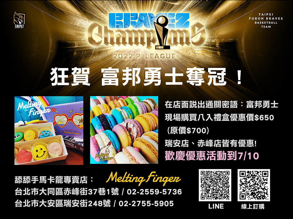 自 6 月 28 日至 7 月 10 日期間來店面説出通關密語「富邦勇士」,現場購買 8 入禮盒享優惠 NT$650。