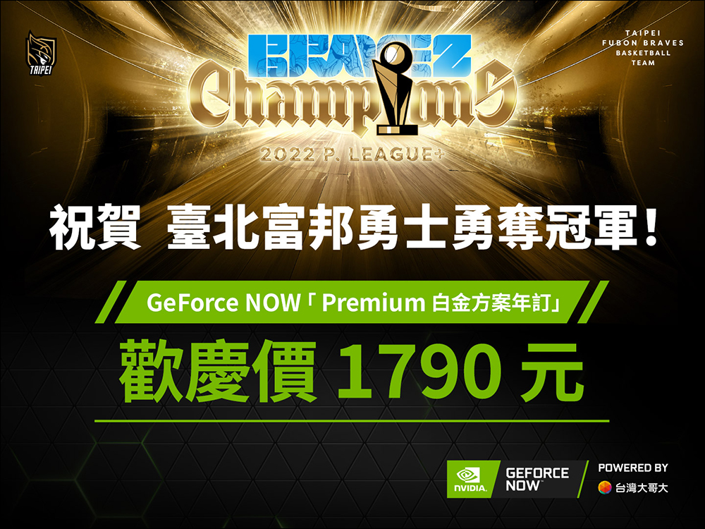 自 6 月 28 日至 7 月 1 日期間, GeForce NOW 延續這份喜悅,限時優惠推出 「Premium 白金方案年訂1,790 歡慶價」訂閱序號,只要輸入專屬優惠序號「FUBONBRAVES」, GeForce NOW 白金方案年訂只要 NT$1,790(原價 NT$2,388)。