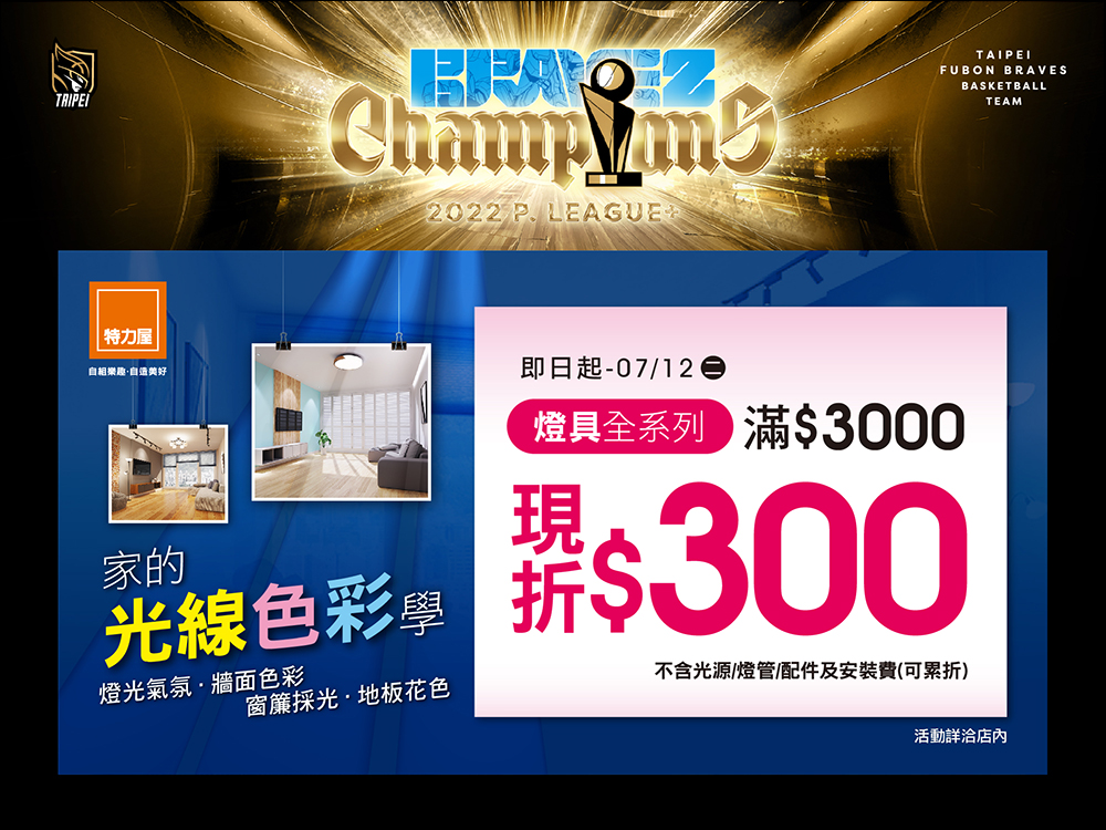 自 6 月 28 日至 7 月 12 日期間,特力屋全台實體門市享燈具全系列滿 NT$3,000 折 NT$300 優惠。