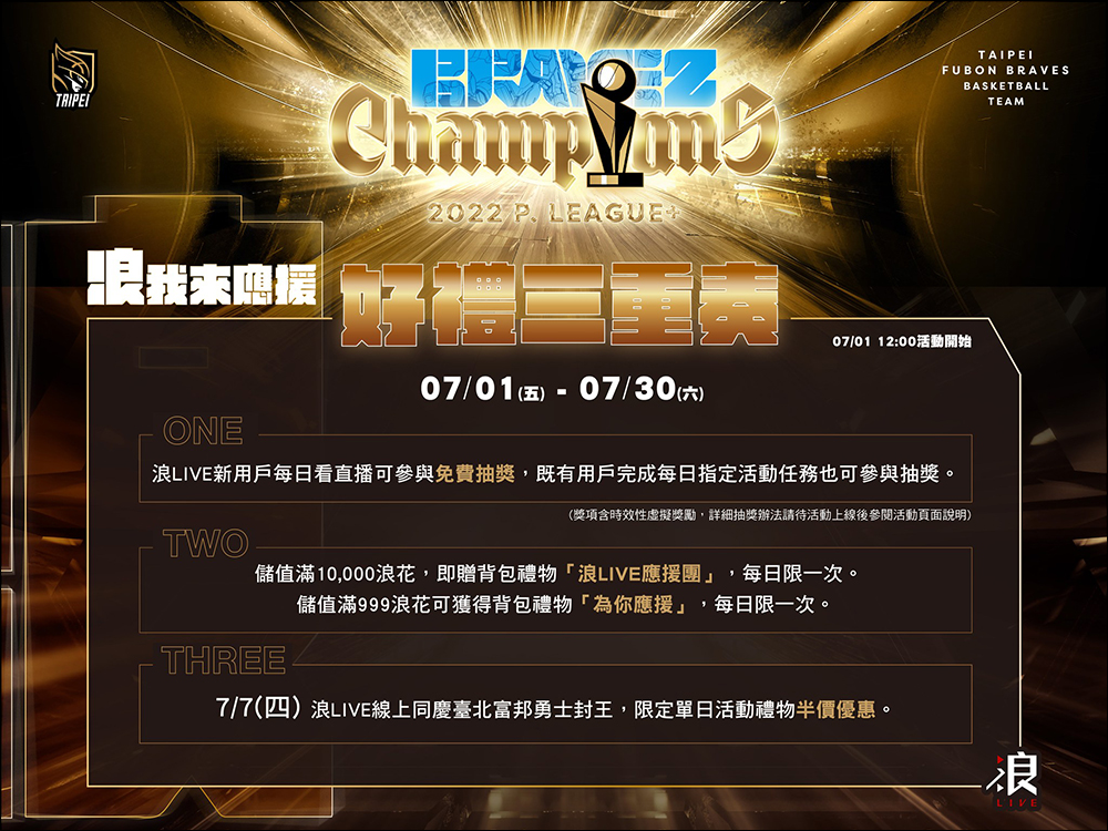 自 7 月 1 日 12:00 起至 7 月 30 日期間,浪 LIVE 推出以下優惠活動: