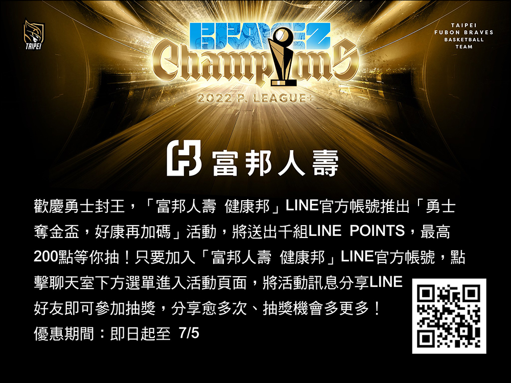 自 6 月 28 日至 7 月 5 日期間將「富邦人壽 健康邦」 LINE 官方帳號加為好友,點擊聊天室下方選單「勇士奪金盃,好康再加碼」」活動頁面,將活動訊息分享給 LINE 好友即可參加抽獎,將送出千組 LINE POINTS,最高 200 點。