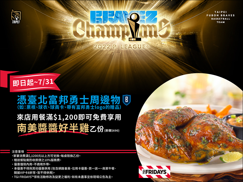 自 6 月 28 日至 7 月 31 日期間,憑台北富邦勇士周邊(如:球賽票根、球衣、球員卡等待有台北富邦勇士 Logo 的贈品),店內用餐滿 NT$1,200 即可免費享用南美醬醬好半雞乙份(原價 NT$690)。