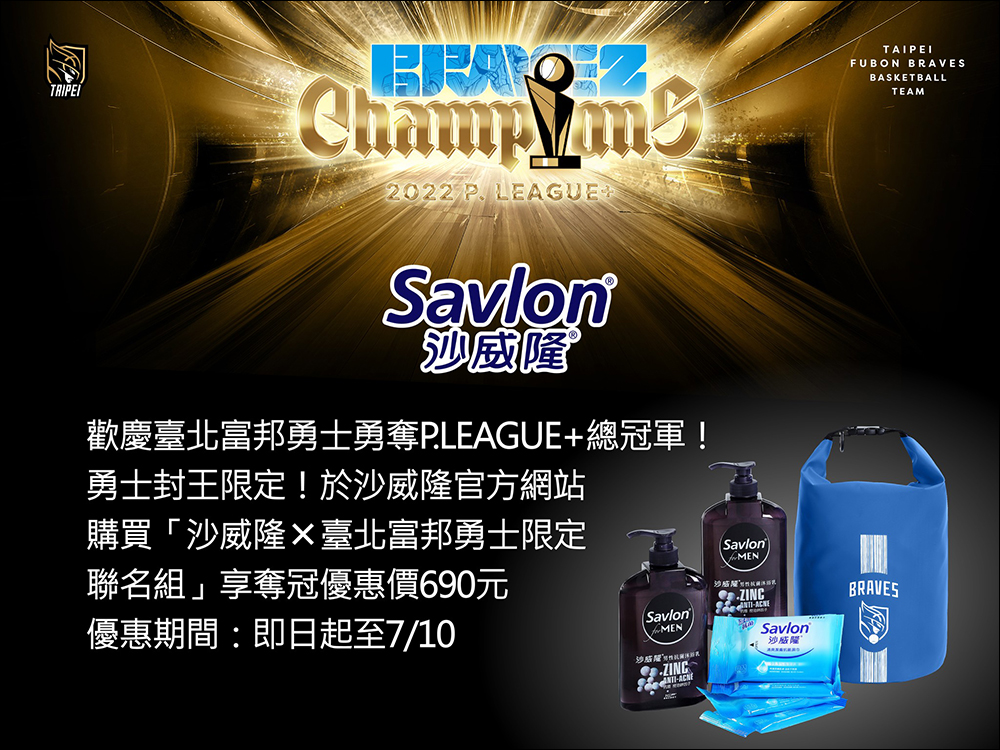 自 6 月 28 日至 7 月 10 日期間,妤沙威隆官方網頁購買「沙威隆x台北富邦勇士限定聯名組」,享奪冠優惠價 NT$690(原價 NT$890)。