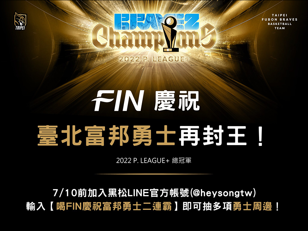 自 6 月 28 日至 7 月 10 日期間,加入黑松LINE 官方帳號(@heysongtw),並於對話框輸入「喝FIN慶祝富邦勇士二連霸」,即可抽富邦勇士系列短 T、帽子等週邊商品(共 10 名)。