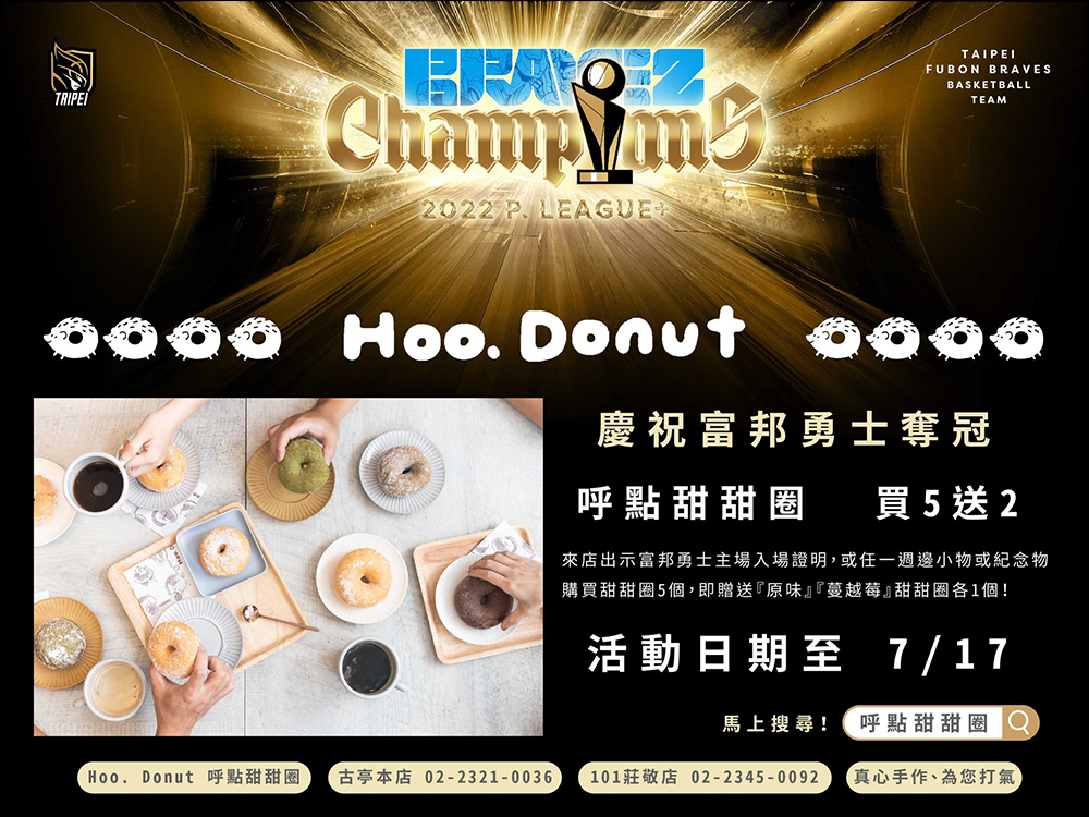 自 6 月 28 日至 7 月 12 日期間,呼點甜甜圈來店購買 5 個甜甜圈(不限口味),就送招牌原味甜甜圈一枚。攜帶能證明是富邦勇士球迷的週邊小物,再贈美式咖啡一杯。
