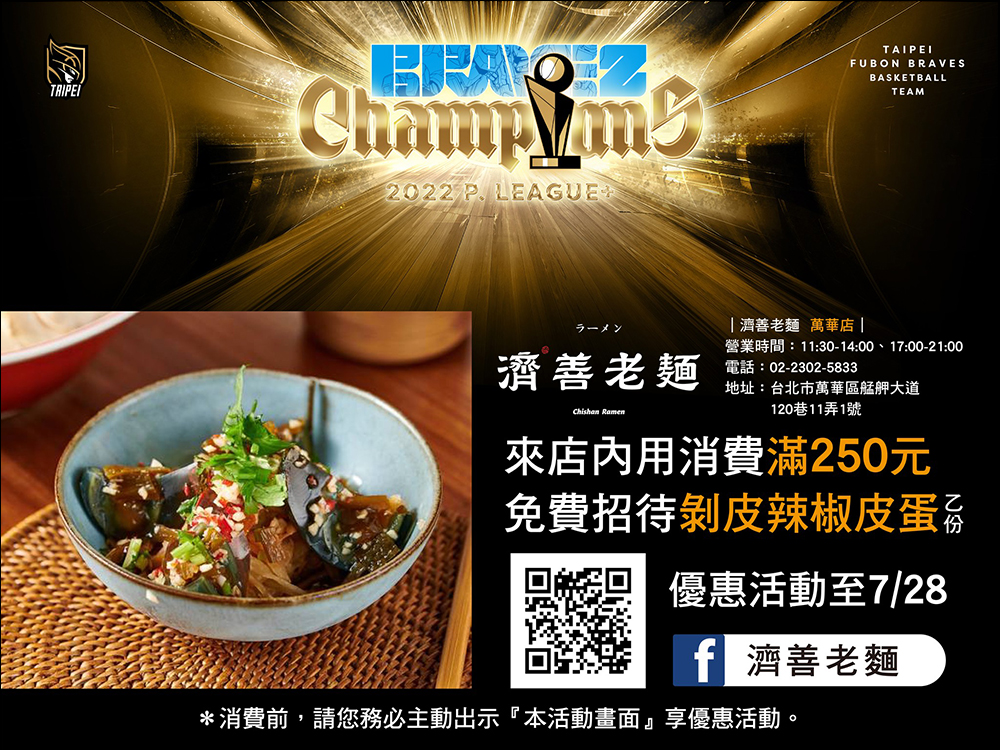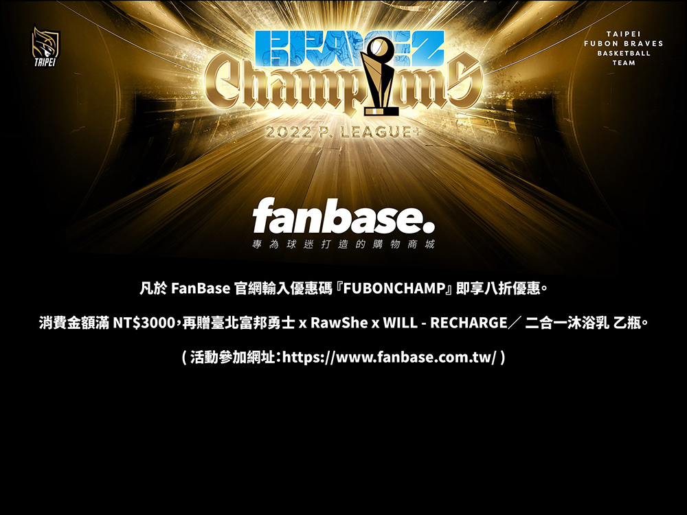自 6 月 28 日至 7 月 31 日期間,凡於 FanBase 官網輸入優惠碼「FUBONCHAMP」即享 8 折優惠。消費金額滿 NT$3000,再贈臺北富邦勇士 x RawShe x WILL - RECHARGE/二合一沐浴乳乙瓶。