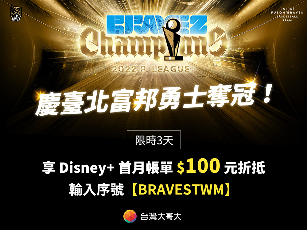自 6 月 28 日至 6 月 30 日期間,輸入優惠序號【BRAVESTWM】申辦台灣大哥大Disney+單購月訂方案,享首月帳單折 NT$100 ,限量 200 名。