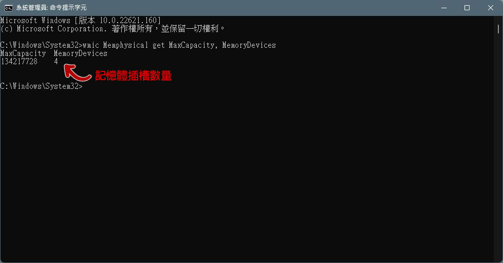 - 輸入「wmic Memphysical get MaxCapacity, MemoryDevices」後按下 Enter,即可看到畫面上顯示你電腦中配備的記憶體插槽數量。