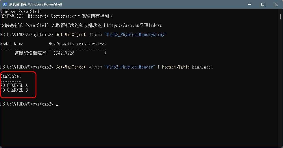 - 接著輸入「Get-WmiObject -Class "Win32_PhysicalMemory" | Format-Table BankLabel」後按 Enter,可以看到目前已經安裝在電腦上的記憶體數量與被佔用的插槽。