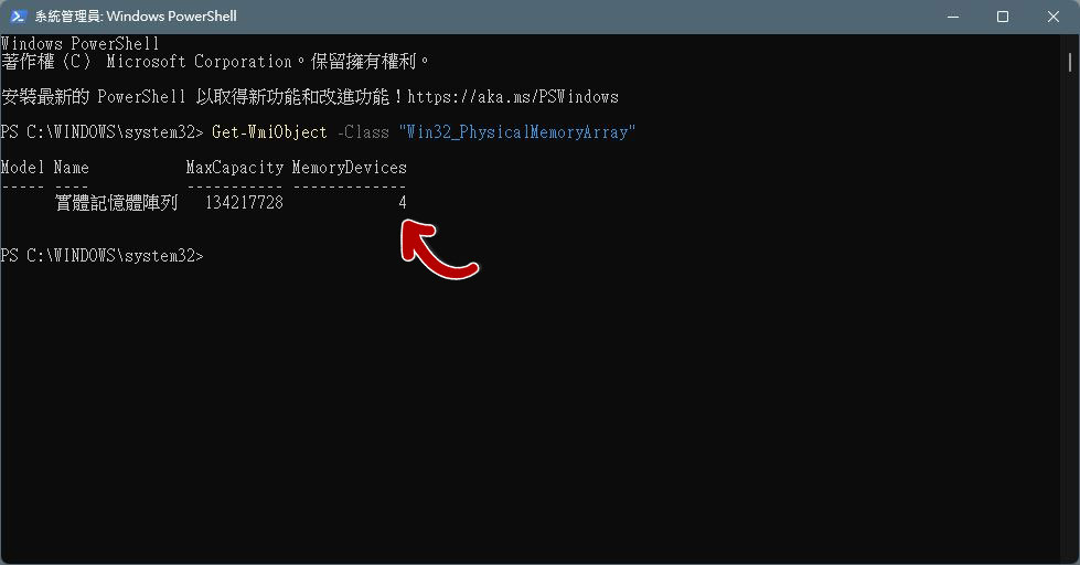 - 輸入「Get-WmiObject -Class "Win32_PhysicalMemoryArray"」後按下 Enter,可獲知電腦上總共有幾個記憶體插槽。