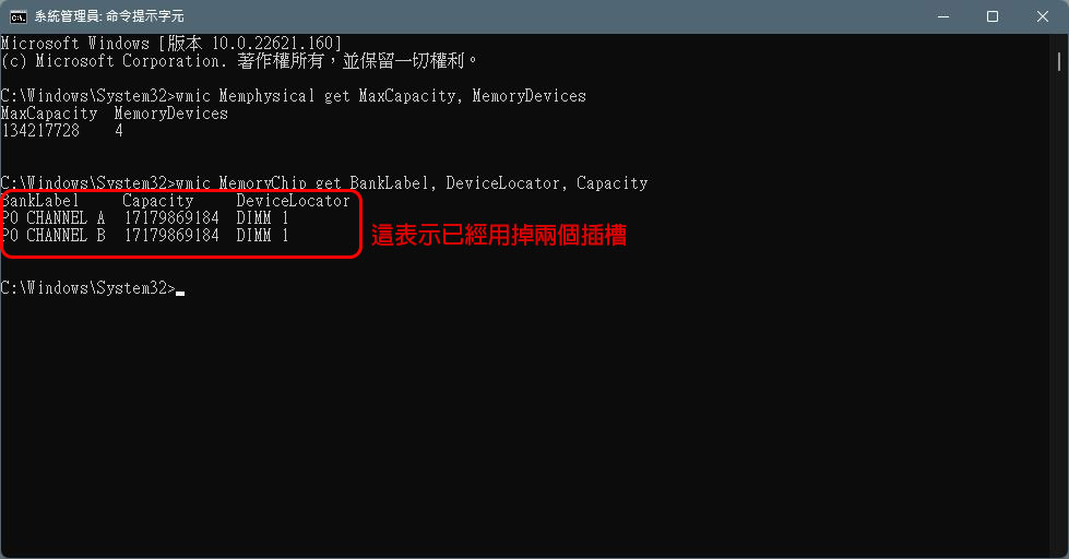 - 接下來輸入「wmic MemoryChip get BankLabel, DeviceLocator, Capacity」後按下 Enter,檢查已經佔用的插槽。