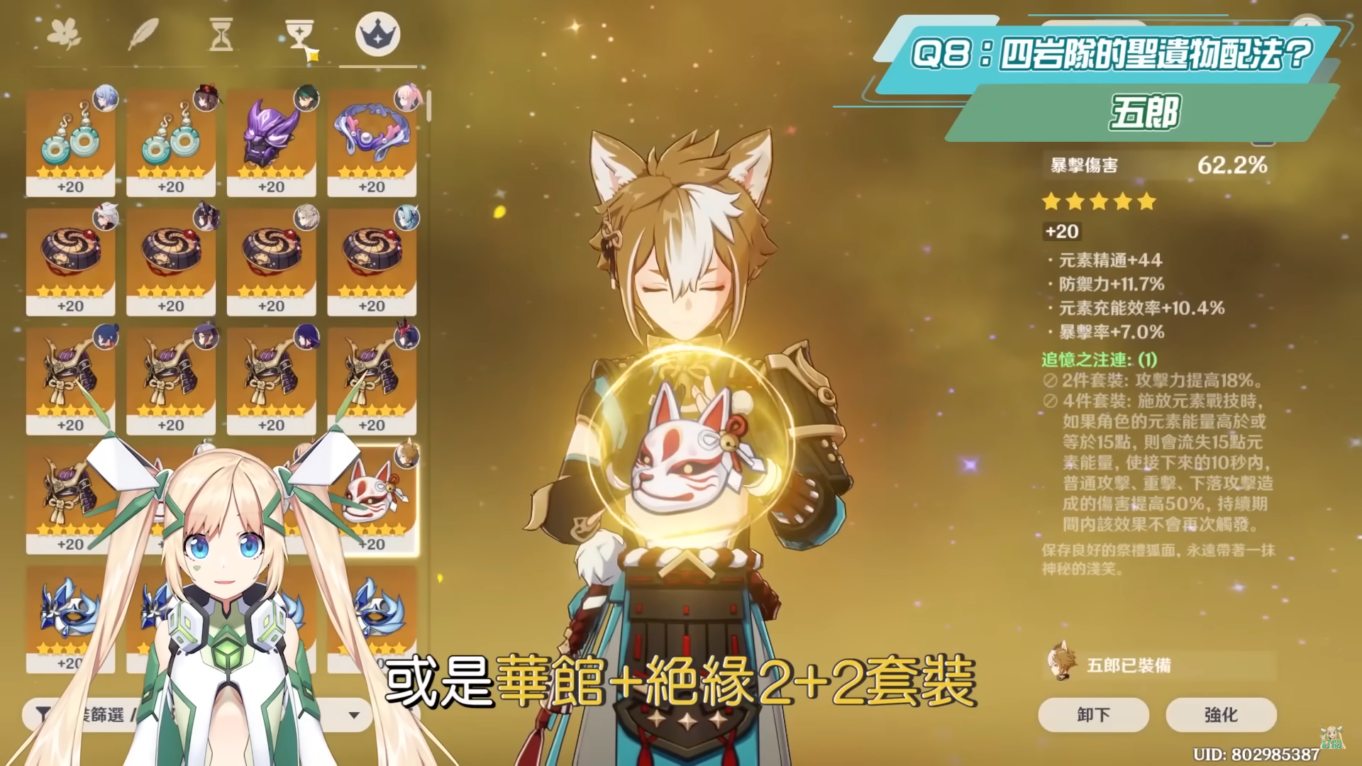 五郎的部分可以選擇華館4件套、或是華館+絕緣2+2套裝,時之砂、空之杯和禮之冠的主屬性走輔助向,可以選擇元素充能效率、防禦力%數、防禦力%數,若走偏輸出向則是防禦力%數、岩元素傷害、雙爆為主,副屬性元素充能效率>防禦力%數>防禦力,雖然防禦力越高越影響五郎的BUFF能力,但五郎必須考慮隊伍循環跟上後才能考慮換防禦力%數。