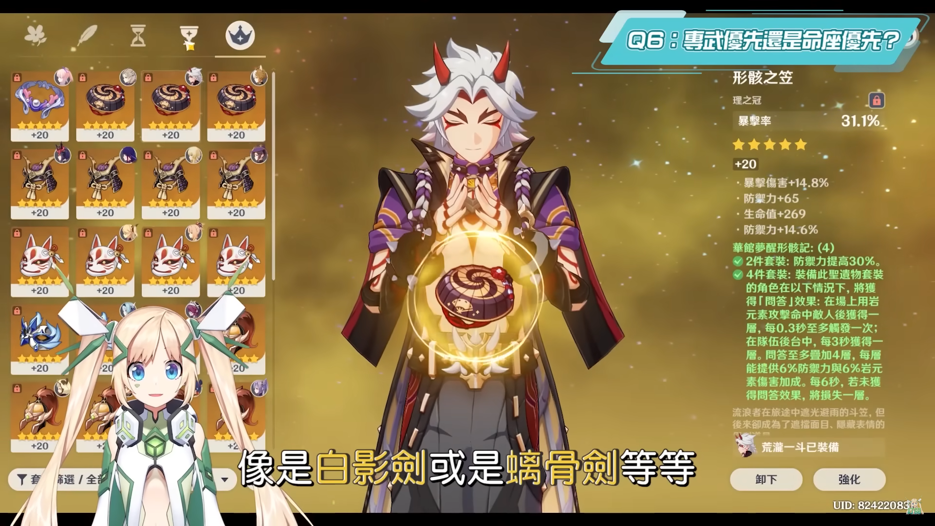 一斗的部分為華館4件套、時之砂、空之杯和禮之冠的主屬性選擇防禦力%數、岩元素傷害和雙暴為主,副屬性雙暴>防禦力%數>防禦力。