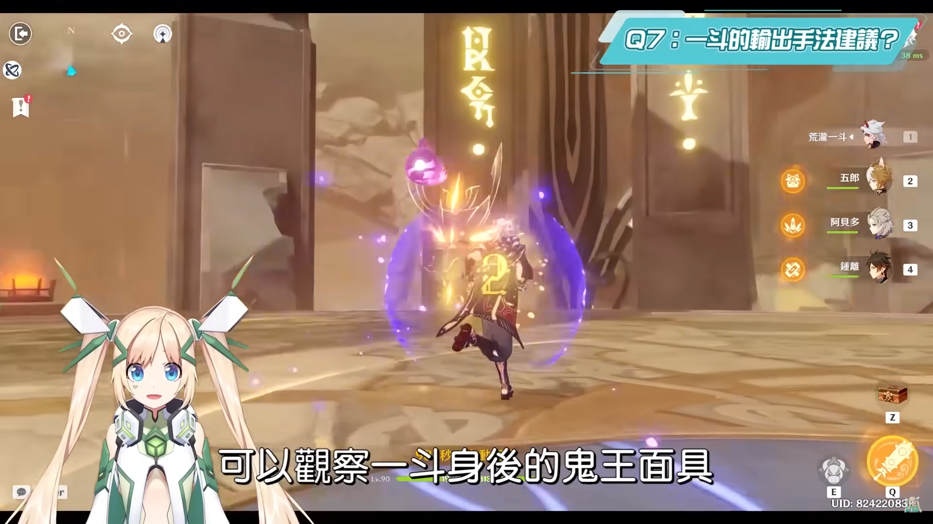 一斗的輸出方式是透過核心Q大招來打連續重擊傷害,不過在一斗的傷害打出最高上限之前,就要注意被動「荒瀧逆袈裟」的層數堆疊,詳細機制也可以回去查看先前的影片,荒瀧逆袈裟一共有5層,若是疊滿BUFF,在一斗連續重擊的最後一擊就會有大量傷害,簡單來說0命一斗的輸出方式就是打滿四段普攻搭配E技能牛牛阿丑疊層數→長按攻擊鍵打出連續重擊,若是要知道BUFF有沒有疊滿可以觀察一斗身後的鬼王面具,若有五個亮點表示層數疊滿,而如果是滿命一斗,因為已經搭配前面的1命效果,一開大招就有2層,並且後面每0.5秒就多1層,中間有放牛牛命中敵人再加層數,滿命效果更是有一半機率在重擊時可以不消耗層數,因此滿命一斗就是無腦的歐拉歐拉,也不用刻意去計算當前層數多少,因為隨便開幾乎都快滿了,只能說這打擊感真的是超爆炸爽快,0命只能連續重擊5下的話,一斗可以有機會來到10下左右,除了滿命提供的暴傷加成60%外,這額外的連續重擊也直接大幅提升了一斗的輸出上限,而且按鍵也十分簡單,就按住攻擊鍵連續使用重擊即可,主要要注意的就是輔助角的BUFF要全部都給一斗上完後,才會一斗開大,另外牛牛也可以都盡量命中敵人,除了疊層數之外,牛牛的倍率其實也很高,不容小覷,而就算沒有開大,或是遇到岩元素史萊姆的時候,也可以長按攻擊鍵用物理輸出的方式來攻擊,傷害也不算太差。