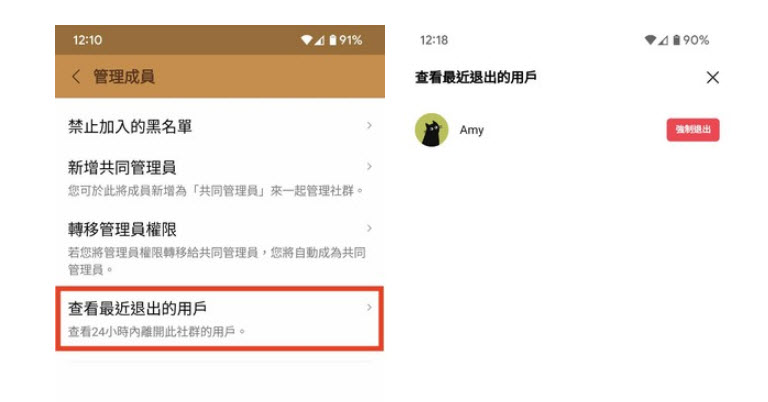 另一種是從管理成員內「查看最近退出的用戶」中設定 ,依序點選社群聊天室右上角的設定>>其他設定>>管理成員>>查看最近退出的用戶,來確認哪些人快閃加入又退出,接著可針對指定用戶「強制退出」。