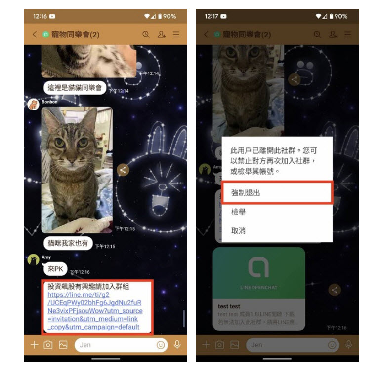 現在若想阻止騷擾帳號入群,有兩種方式可供使用,一是「從社群聊天室中選擇對象直接進黑名單 」,當有帳號丟了一條騷擾訊息就離開聊天室,「管理員」或「共同管理員」點擊他的頭像,就能透過「強制退出」的選項來處理。
