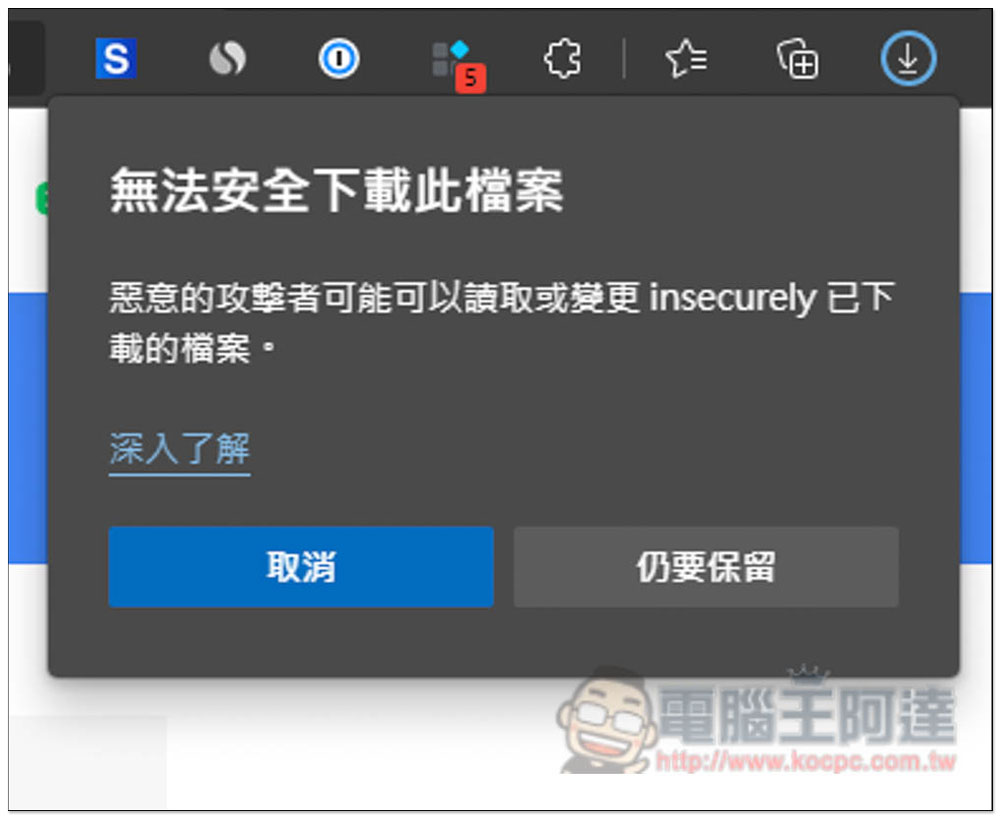會跳出警告,這網站應該沒什麼問題,至少我測試過是這樣,所以按 "仍要保留":