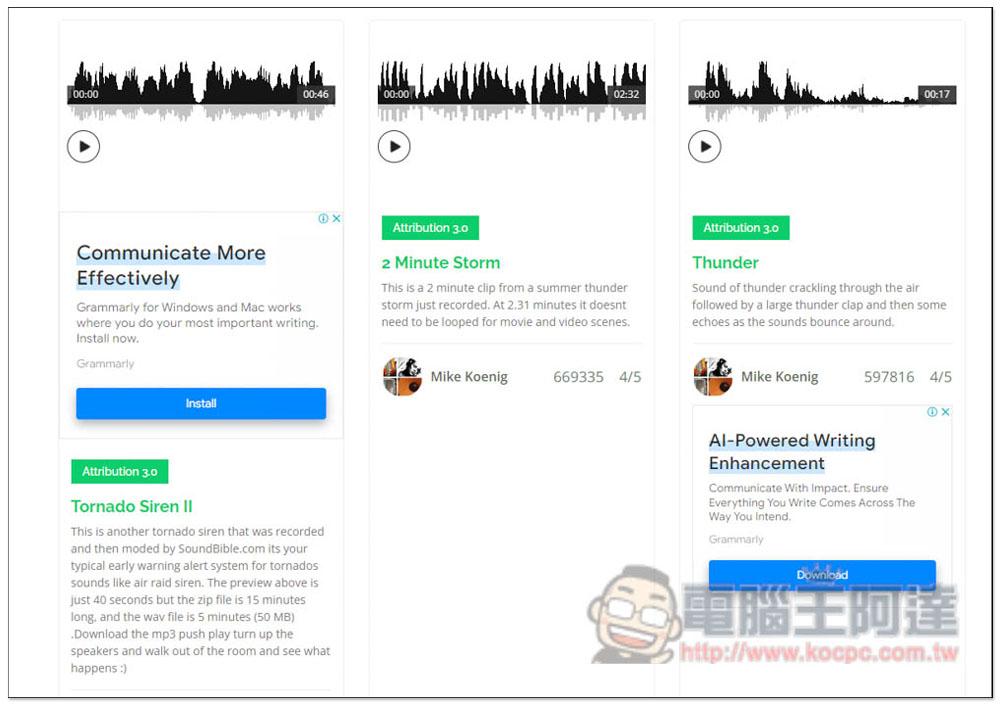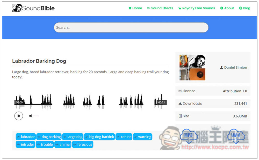 進到 SoundBible 網站之後,首頁就能開始瀏覽免費聲音音效,每一首按播放鍵就能直接試聽,不用進到內頁,下方也會有分享者的資訊,以及有多少人下載過,這邊很多音效都有破萬下載次數,由此可見這網站還蠻多人用的。授權方面也會註明,絕大多數都是 Attribution 3.0,只要標示來源或作者就能用在商業用途,詳細說明可以點我至 CC 網站。上方還有 Sound Effects 與 Royalty Free Sounds 兩個分類,你也可以進到這兩個分類選單找: