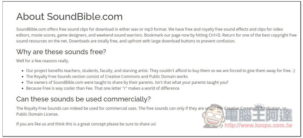 About 關於我頁面有一些簡單說明,這些音樂素材都是老師、學生、藝術家等免費提供的,可以用在商業目的,不過使用前記得查看授權,並不是每一個都行,有些聲音音效僅能用在個人: