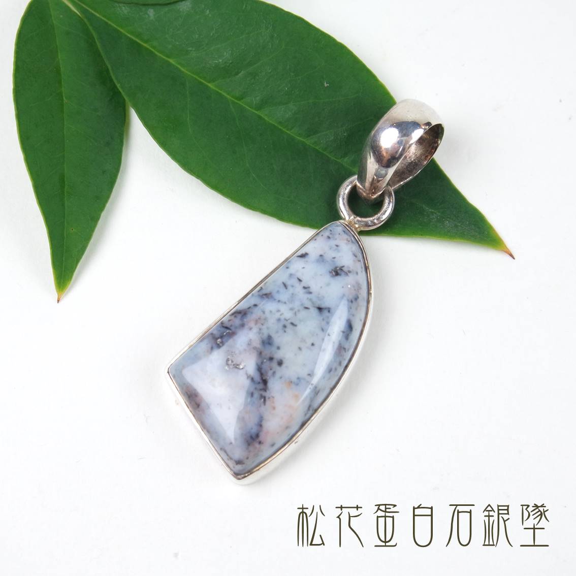 有戴耳環習慣的女孩們看過來囉!蛋白石集所有寶石之美於一身,在羅馬傳說中更被認為是邱比特之石。這款蛋白石耳環折射光芒多變,切割成漂亮的愛心形狀,配戴起來優雅又好看,甚至還可以增加戀愛能量喔!蛋白石推薦 3:松花蛋白石銀墜