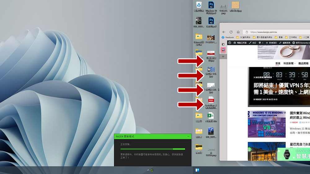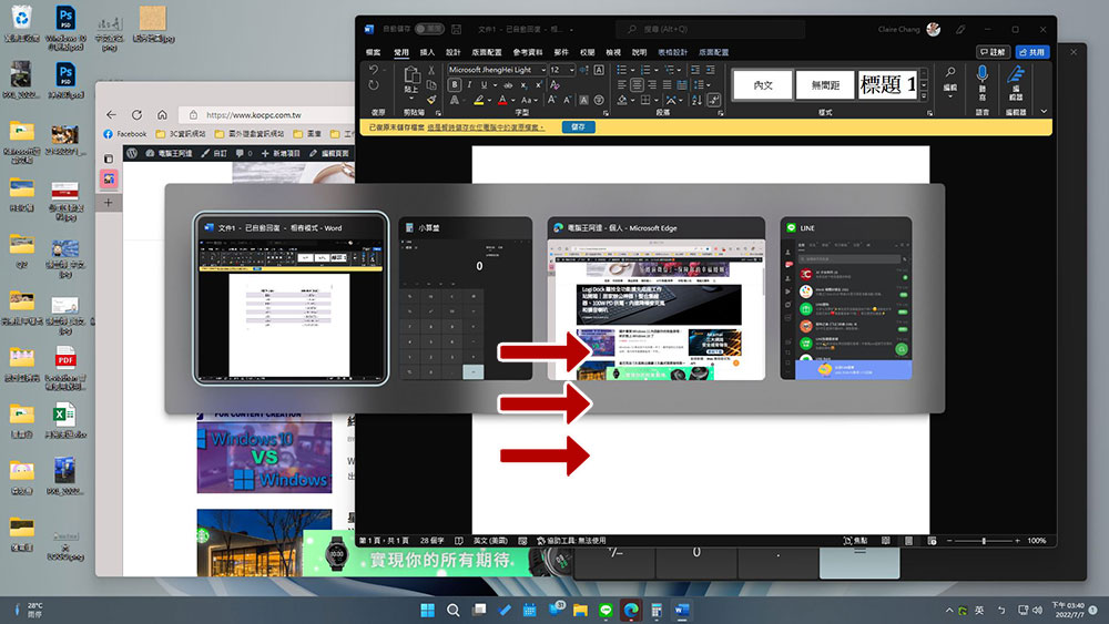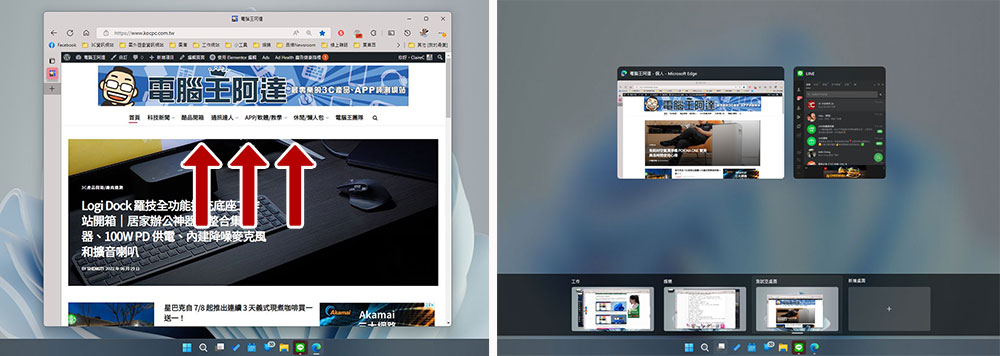如果你用四根手指橫向滑動,可以快速在虛擬桌面間切換,讓你可以更輕鬆地在不同桌面之間快速切換,尤其是若你跟筆者一樣把工作和娛樂之間以不同虛擬桌面來區分,這樣可以幫助你更快地在不同環境間轉換。不過這個手勢與上一個應用程式切換的邏輯不同,它以你虛擬桌面創建的順序為切換依據,透過重複以四指橫滑可以切換到任意一個虛擬桌面上。(這項觸控功能在初始版 Windows 11 上也可用)