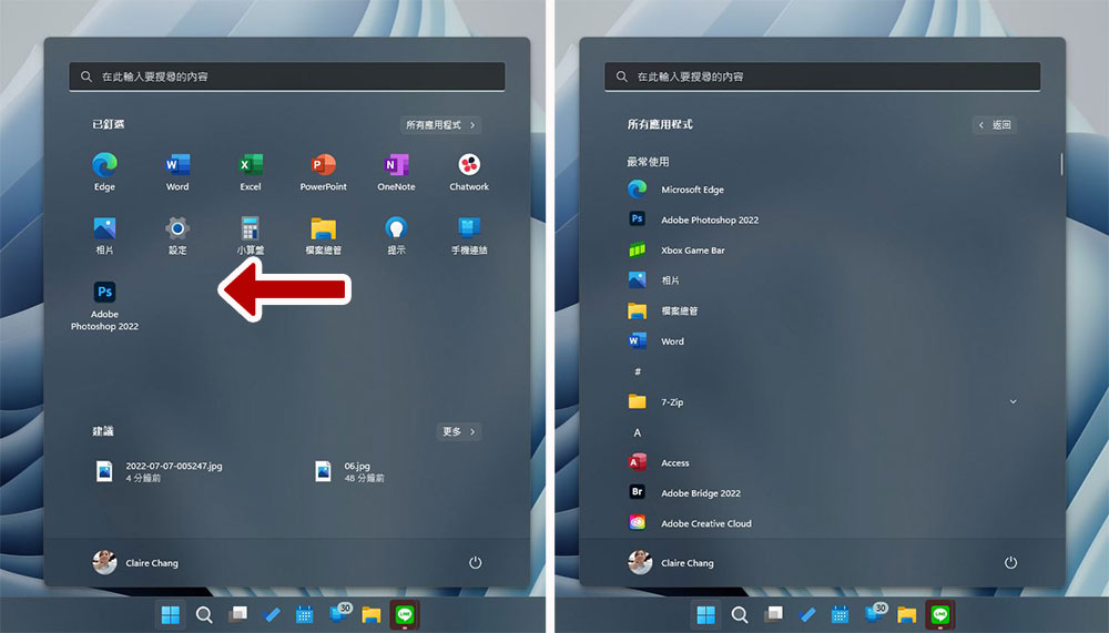 在開始功能表中也可以進行觸控。當你在開始功能表中上半部「已釘選」的部分向左滑動,即可看到所有應用程式清單,你可以在清單中上下滑動來瀏覽;向右清掃則回到開始功能表最初的主頁。