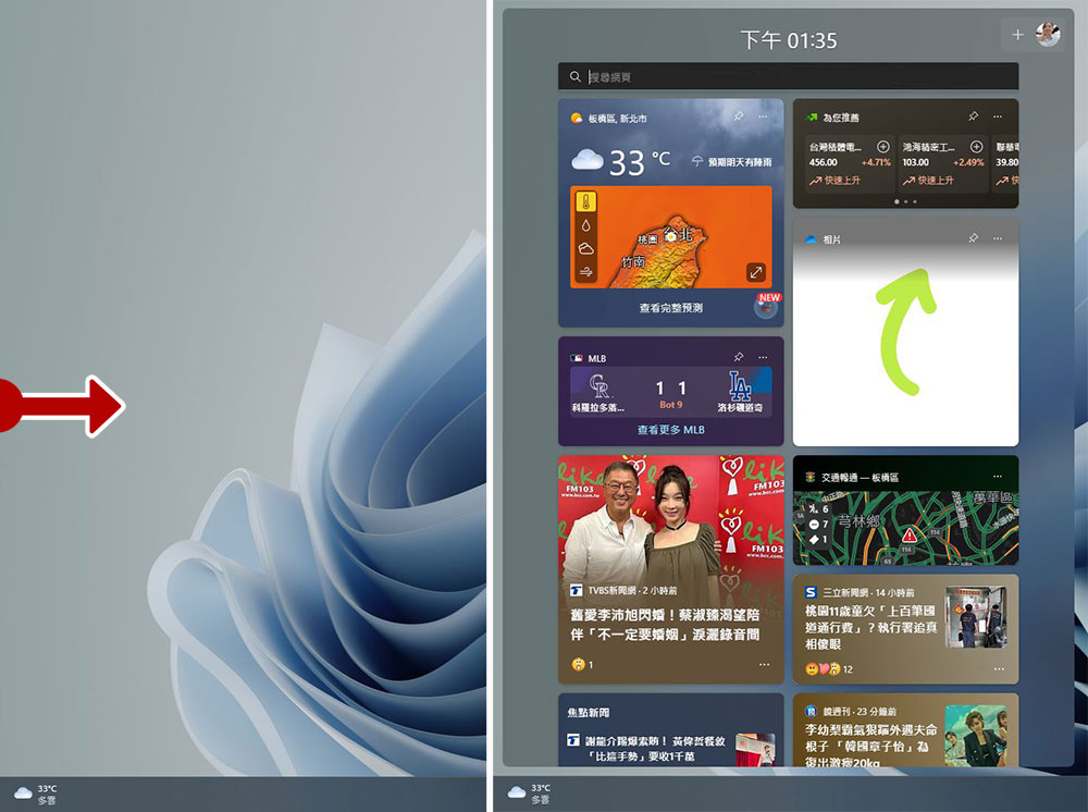 倘若你想要造訪小工具面板,只要從螢幕最左邊向右輕掃,即可展開小工具托盤。不過這邊有點不一樣的是,它會在你進行觸控後立刻自動顯示,不會跟隨手指慢慢展開;要關閉小工具面板也不需要滑動,只要輕觸桌面上或其他內容即可自動將它關閉。