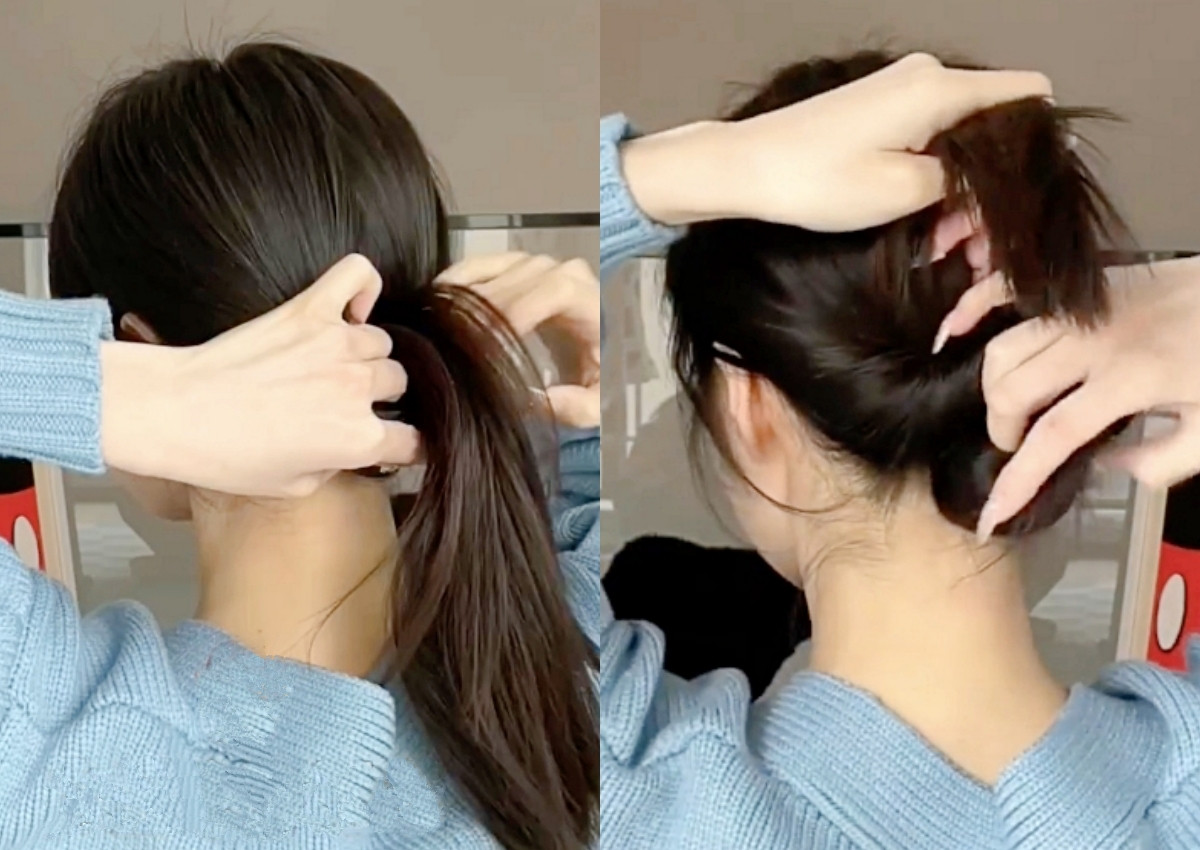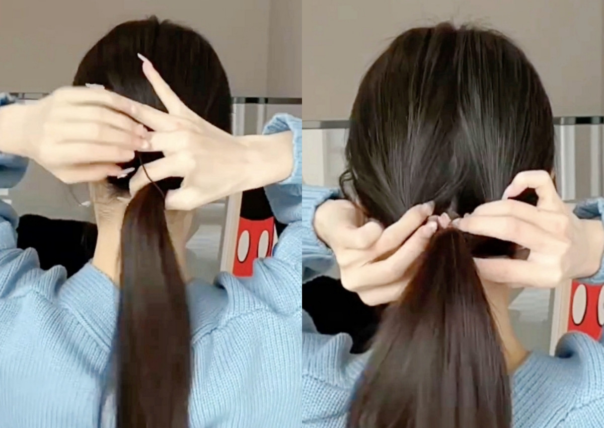 首先先用一個橡皮圈將頭髮綁成馬尾,接著在馬尾中間穿個洞、將馬尾往上反穿進洞裡面。
