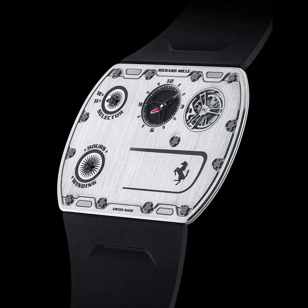 RM UP-01 Ferrari 錶面的相當大面積也嵌入法拉利的品牌商標。無論是工藝、品牌甚至是歷史意義的價值等,都毋庸置疑是相當有話題性的奢華機械錶款。