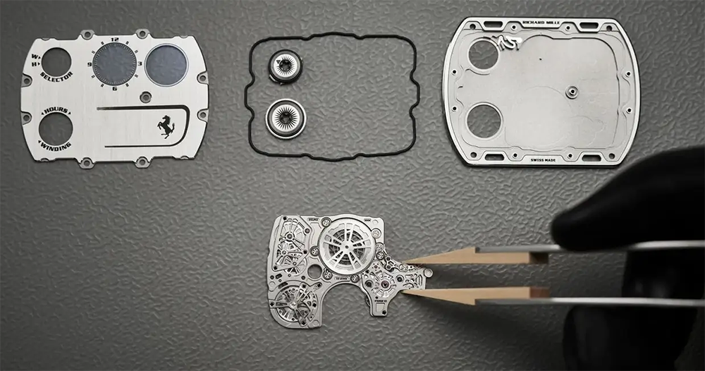 [caption id="attachment_449067" align="alignnone" width="1000"]以 5 級鈦合金所打造的 RM UP-01 Ferrari,從官方圖片的正面觀看,因為感覺一切的元件都沒有一般機械錶那樣的立體。真的會有一種誤以為是智慧錶螢幕顯示出來的感覺。然而轉到側面,就會馬上被那超薄僅 1.75mm 的機身給嚇到。