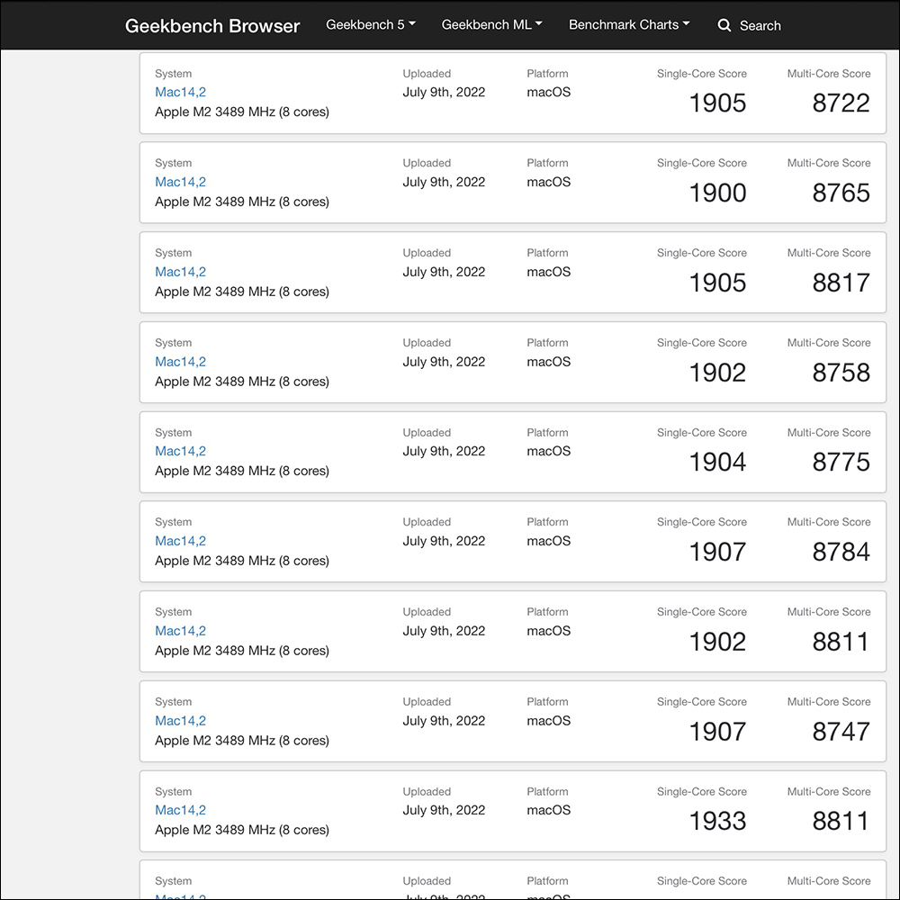 在 Geekbench 資料庫後續也有多筆跑分成績,可觀察到單核得分平均有 1,900 分、多核得分平均也有 8,800 左右。