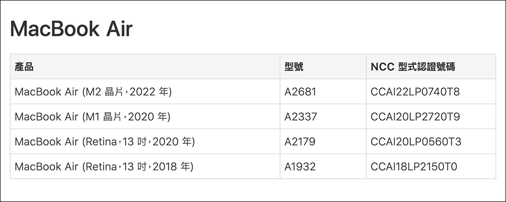 七月初我們曾報導過 MacBook Air(M2)通過台灣 NCC 認證的消息,現在 Apple 也已在官網的「台灣 NCC 認證的 Apple 產品」更新內容將其納入, MacBook Air(M2 晶片,2022 年)的型號為 A2681 , NCC 型式認證號碼為 CCAI22LP0740T8 。