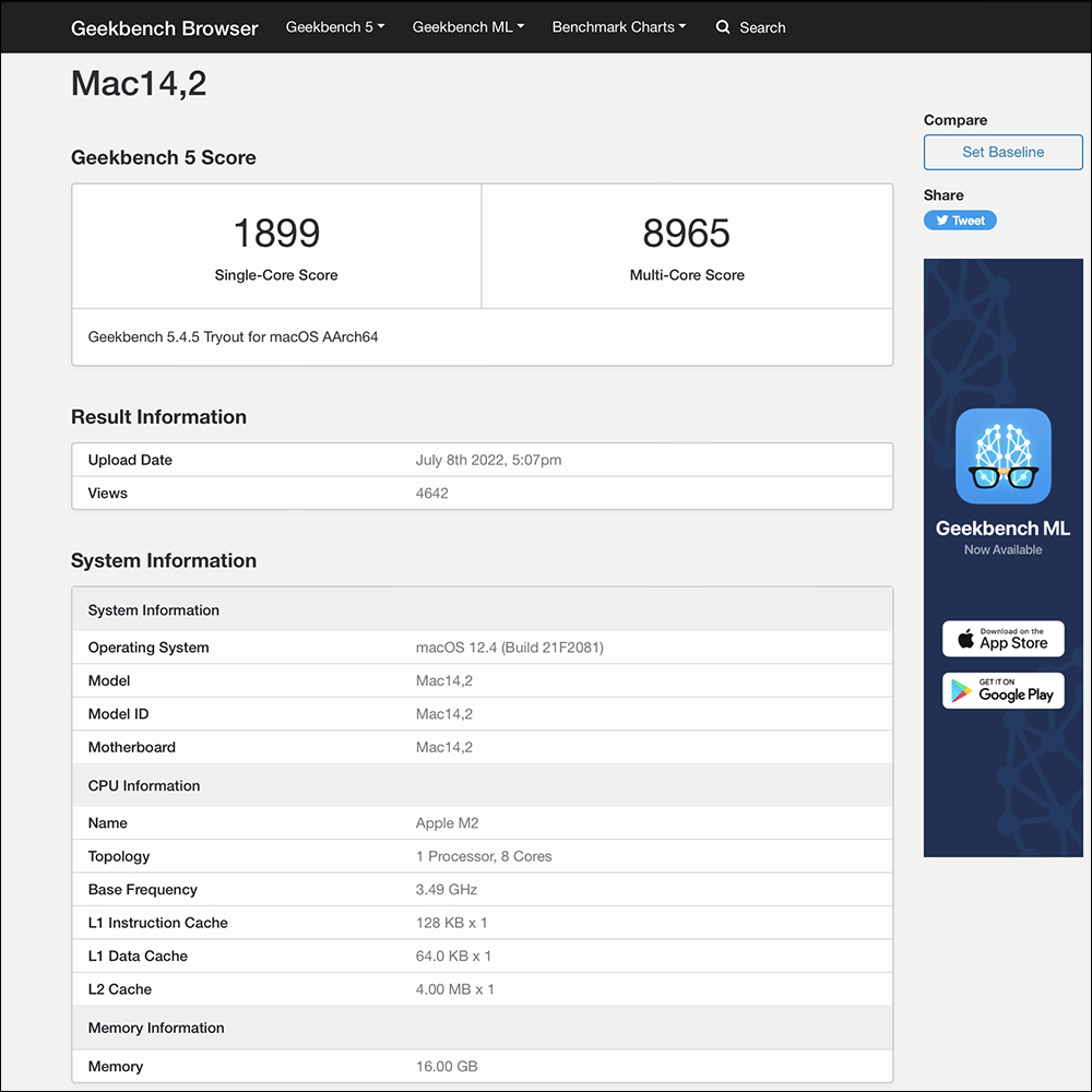 從這次被發現的 M2 版 MacBook Air 代號「Mac14,2」, Geekbench 5 性能跑分結果顯示單核得分為 1,899分、多核得分為 8,965 分。這筆測試的 MacBook Air 為搭載 8 核心 CPU 的 M2 晶片、配備 16GB RAM 的版本。