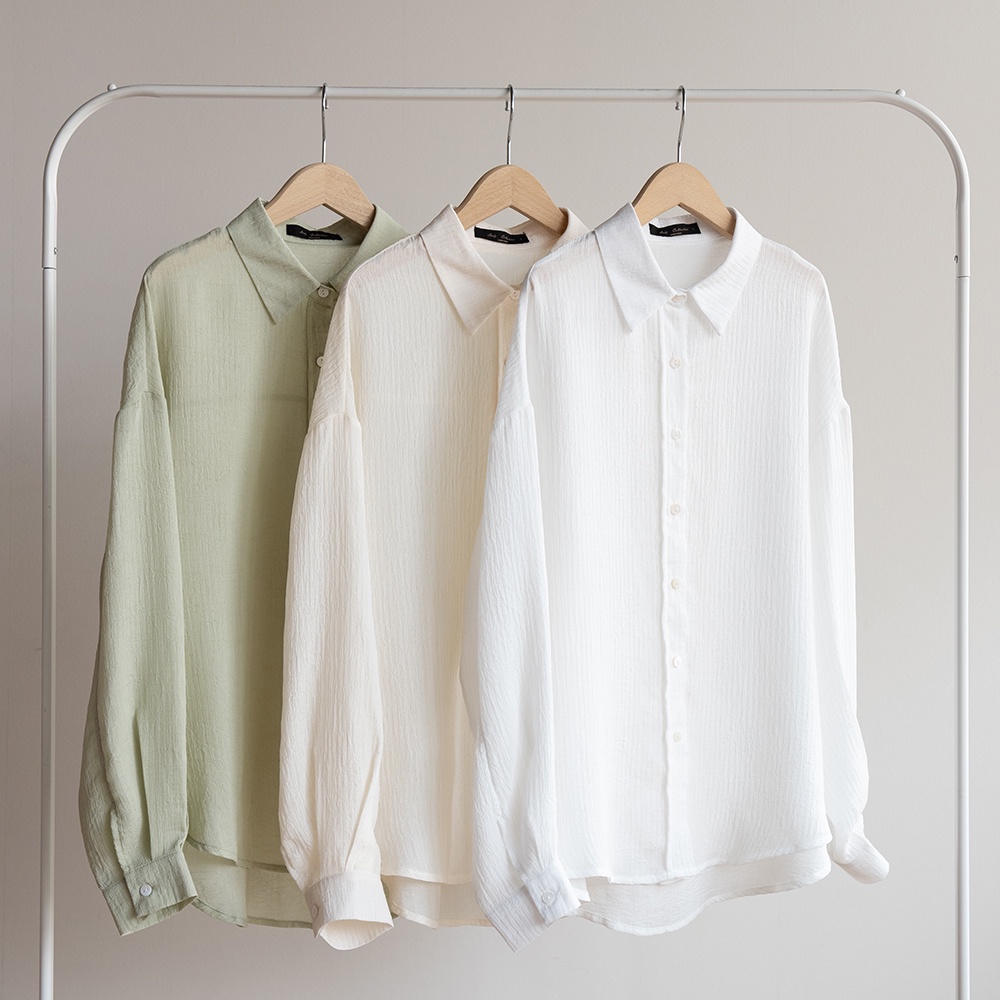最後一款推薦的單品就是透膚襯衫拉!通常這種襯衫都是比較寬鬆版型的,對於想要藏肉的女孩來說是很適合的單品。兼具防曬跟顯瘦的功能,在夏天穿也很適合。裡頭可以簡單搭配Bra T或小可愛都很適合。