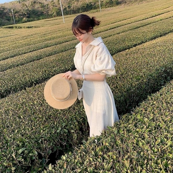 顯瘦單品推薦二:簡約襯衫落肩公主袖後鬆緊洋裝