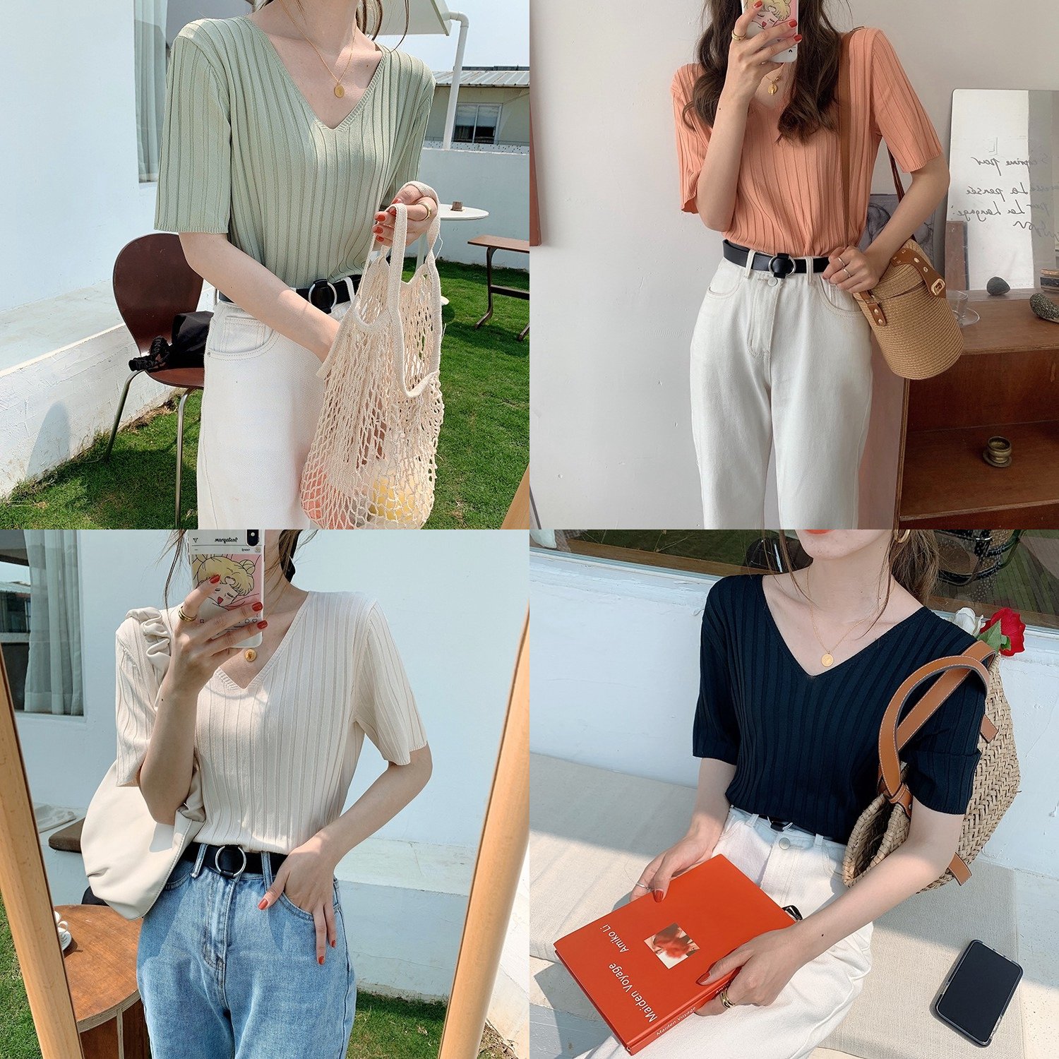 V領剪裁設計也是顯瘦的常見單品,尤其如果你是臉型偏圓的朋友,穿V領的上衣也可以讓臉型看起來比較瘦一點。另外V領剪裁上衣穿搭也很簡單,最不敗的就是搭配牛仔單品,或者韓妞穿搭中最常出現的白色寬褲。優雅知性顯瘦單品,選他準沒錯。