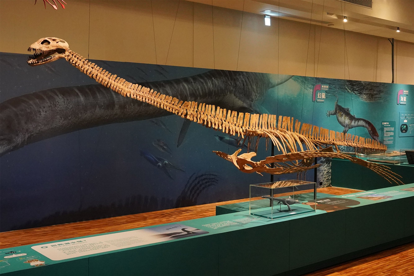 展覽從尼斯湖水怪傳聞談起,介紹活躍於中生代的蛇頸龍、海龍、滄龍和魚龍等水棲爬行動物的起源、分布、和演化,並展出各類群難得一見的珍貴化石,讓大家了解水棲爬行動物家族的生態奧秘,包含他們是如何從水中登陸後演化出四肢、重返水域後四肢再轉化為鰭狀肢,適應環境的演變歷程,並從中省思物種滅絕的原因。
