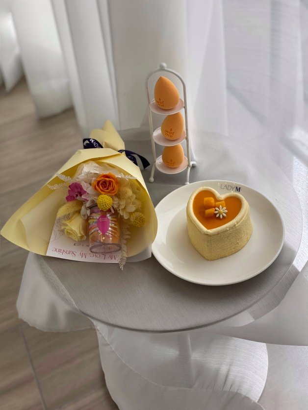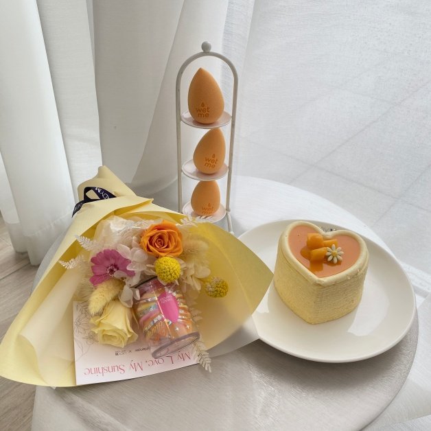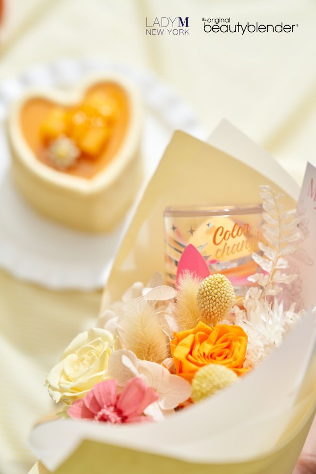 組合:愛心芒果千層*1 顆+beautyblender 豔陽美妝蛋永生花束*1 束