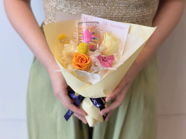 另外,為了情人節的到來,永恆戀夏組合內更加碼附上「情人節花束」,以擁有「永不凋謝的愛」涵義的永生花材為設計理念,均採手工製作,色系選用浪漫粉、純潔白、耀眼黃和洋溢橘,小卡上特別寫上傾訴愛意的「My Love, My Sunshine」,為大家的戀情加溫!