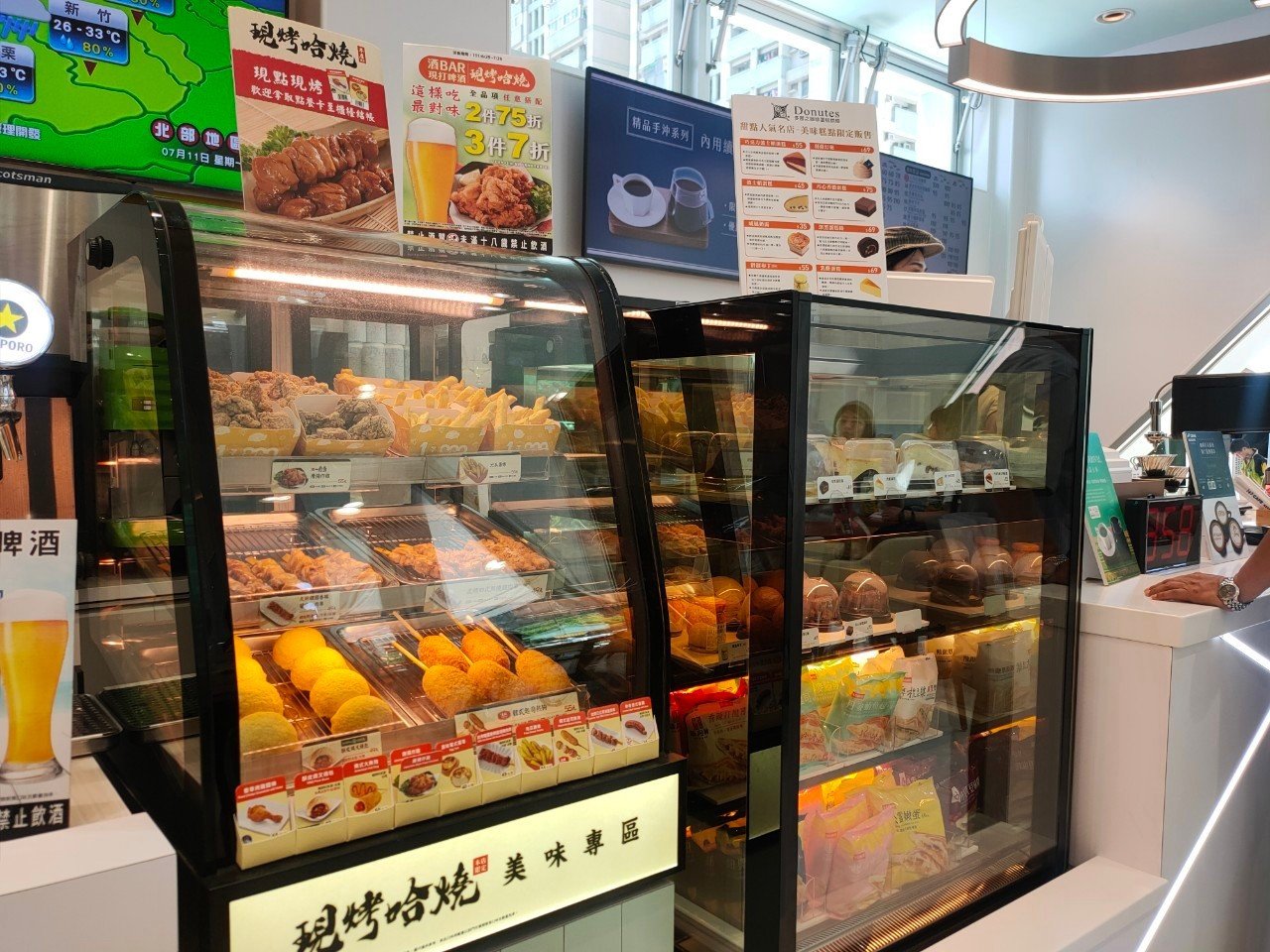 邊喝酒還可以邊搭配一旁的「現烤哈燒專區」,有串燒、炸物以及多那之的點心等商品,炭烤日式照燒雞肉串、韓式起司熱狗、一風堂唐揚炸雞、添好運酥皮焗叉燒包、以及新上市的王田生土司都是不可錯過的美食,讓上班族都可以把這裡當小型居酒屋PreDrink一下,有趣的是這裡還放上了小型電視牆,讓大家可以看比賽配宵夜呢~