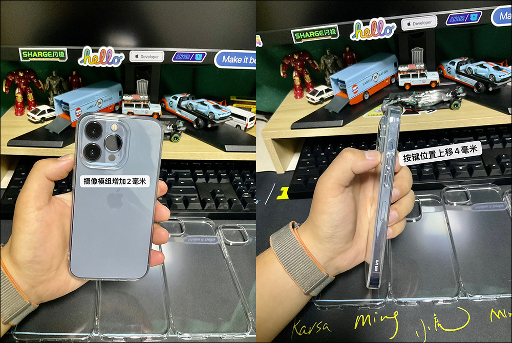 從 iPhone 14 Pro 的第三方保護殼裝在 iPhone 13 Pro 機身上的照片,可以發現新款的相機模組寬度增加 2mm ,側邊的按鍵則向上移動 4mm 。
