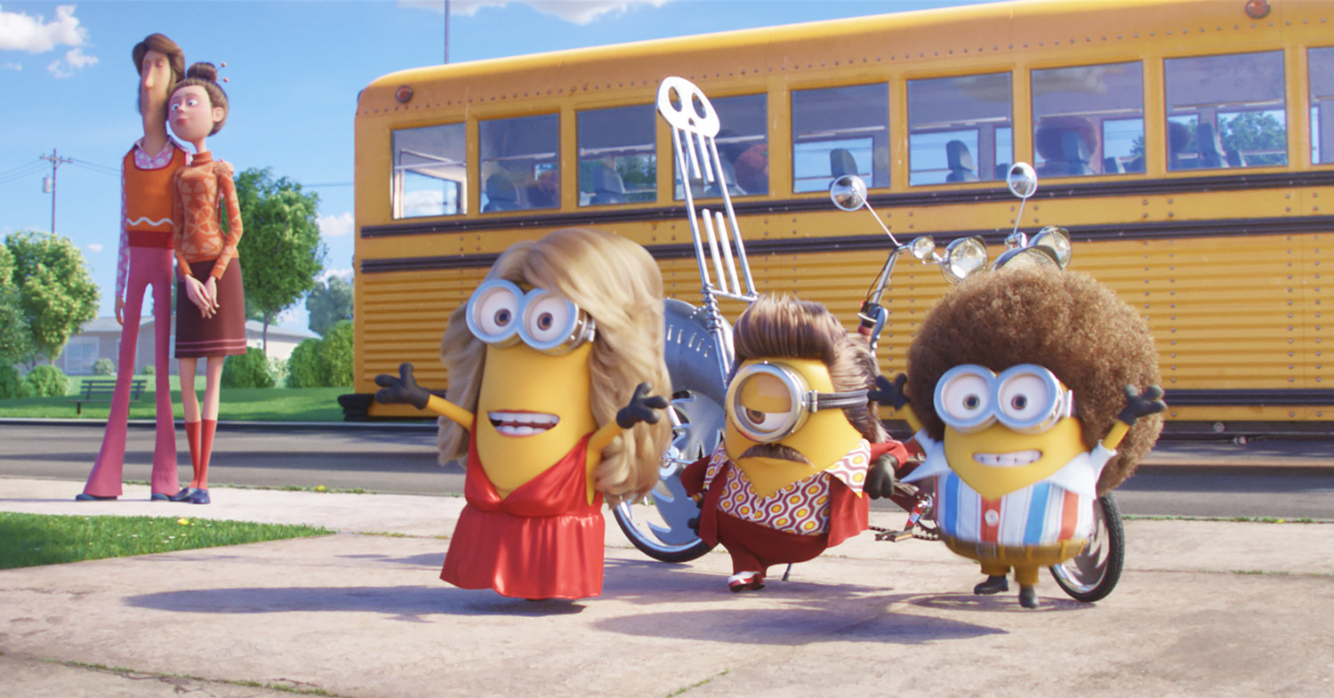 電影背景為70年代的美國,所以也融入了當時的奇特流行風潮「嬉皮文化」,說到嬉皮,不少人都會想到色彩絢爛的服飾、花俏誇張的髮型,男生留長髮、爆炸頭,DISCO唱片等等元素也被巧妙地復刻在電影中。像是這張劇照小小兵身上的花襯衫、旁邊的人身穿的喇叭褲、超拉風的哈雷機車更是家家戶戶都要有一部,都讓人醉心於懷舊復古的70年代。