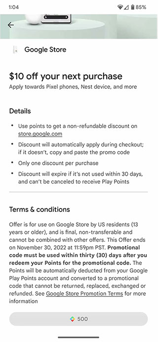 目前系統顯示可兌換的最大面額是 200 美元優惠券(共有 10、50、100 和 200 四種 ),每種面額都只能兌換一次,可以讓你用更便宜的價格買入手機,甚至可以換到免費的耳機跟智慧音箱。你兌換的優惠券會在 Google 線上商店購物結帳時自動套用,所以這代表兩者之間是以 Google 帳號互相關連,因此你不必手動複製並貼上優惠碼之類的動作,不過這也表示你無法將優惠券轉讓給別人使用。