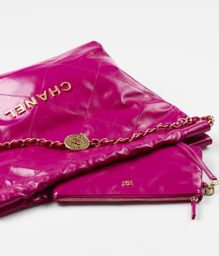 CHANEL 22包柔軟輕巧大容量,非常適合做為日常包款,22包共推出大、中、小三種不同尺寸,以及一款後揹包款,而色系除了有經典的黑、白兩色外,也有適合春夏的粉色、紫色、海軍藍以及前衛的金屬色系可以選擇,包括包身上的CHANEL品牌字樣與穿鏈都有不同的色系搭配。