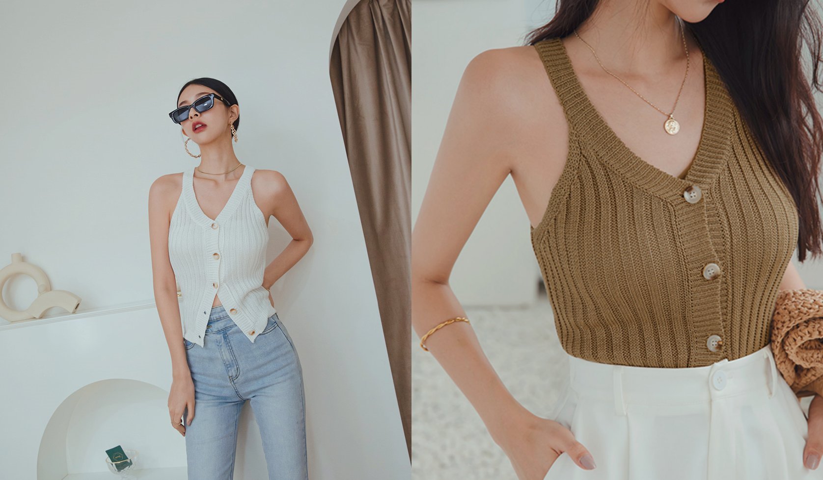 削肩單品推薦七:顯瘦削肩排釦薄針織背心