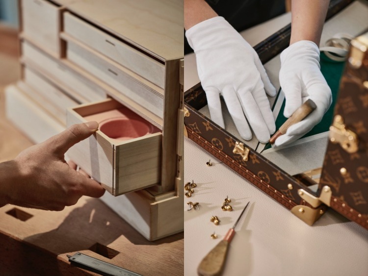該硬殼箱內部以松綠色絨布質面料,搭配六層的小抽屜包裹 149 張麻將,其麻將在用料上也十足用心,除了以手工刻印製作外,Louis Vuitton 更以堅韌耐保存的核桃木為材料,讓一顆麻將不只手感極佳,還能讓妳永久收藏。